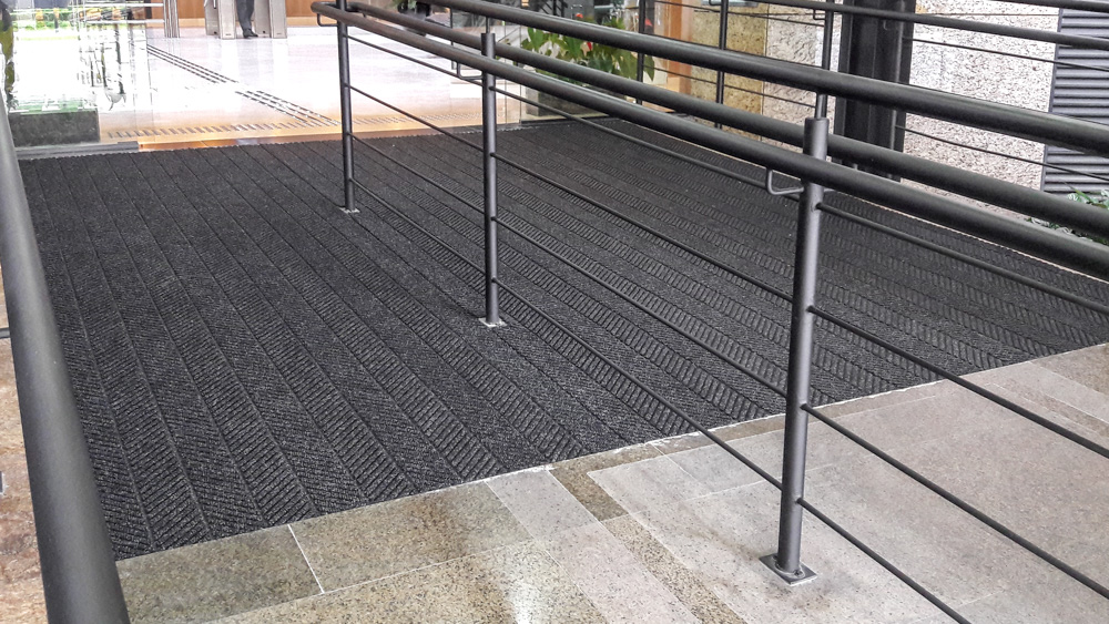Seguindo as normas da ABNT NBR 9050 que regulamenta a acessibilidade a edificações, o cliente optou por rebaixar seu piso numa rampa da entrada principal, que também recebe o fluxo de clientes da agência do Banco do Brasil.